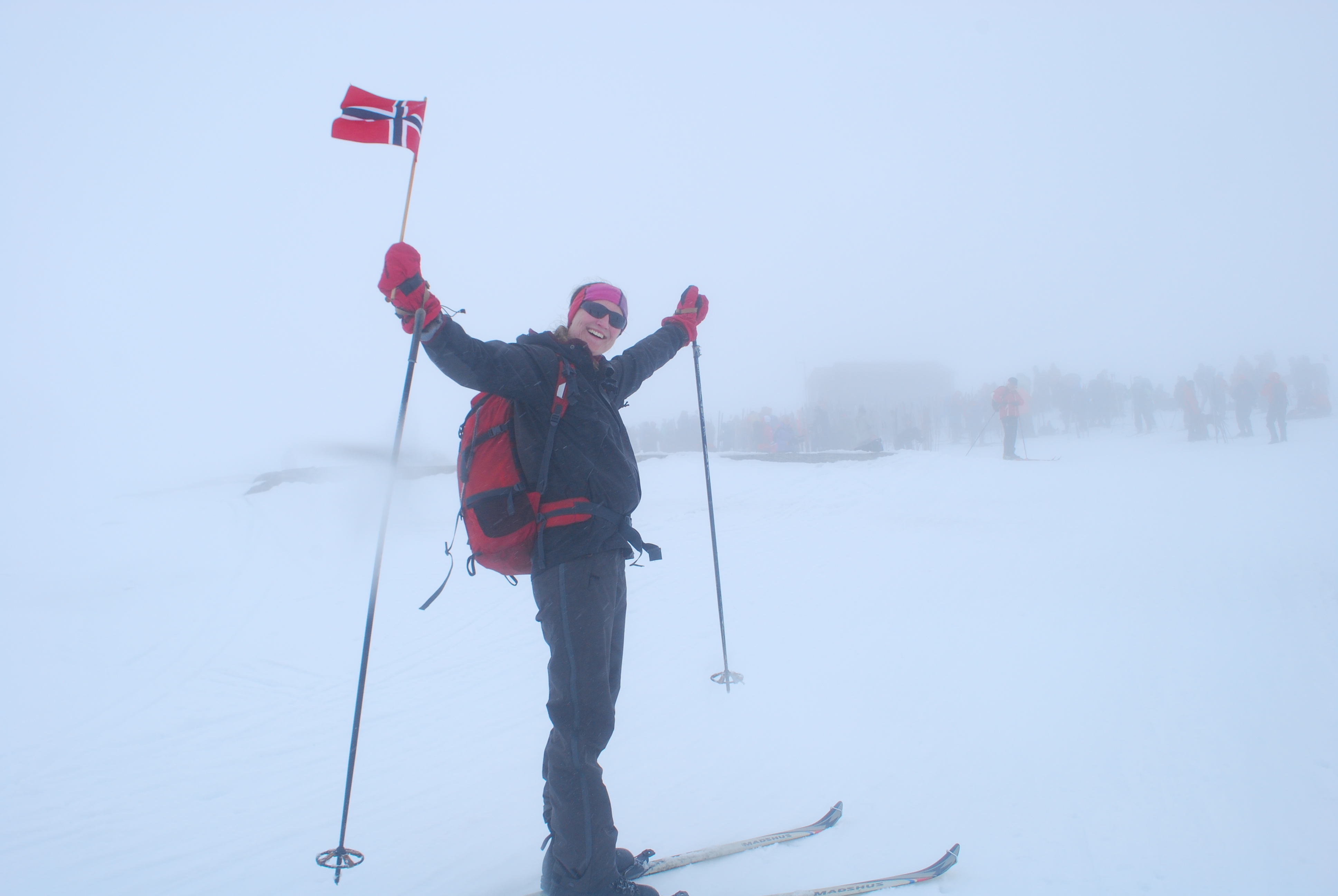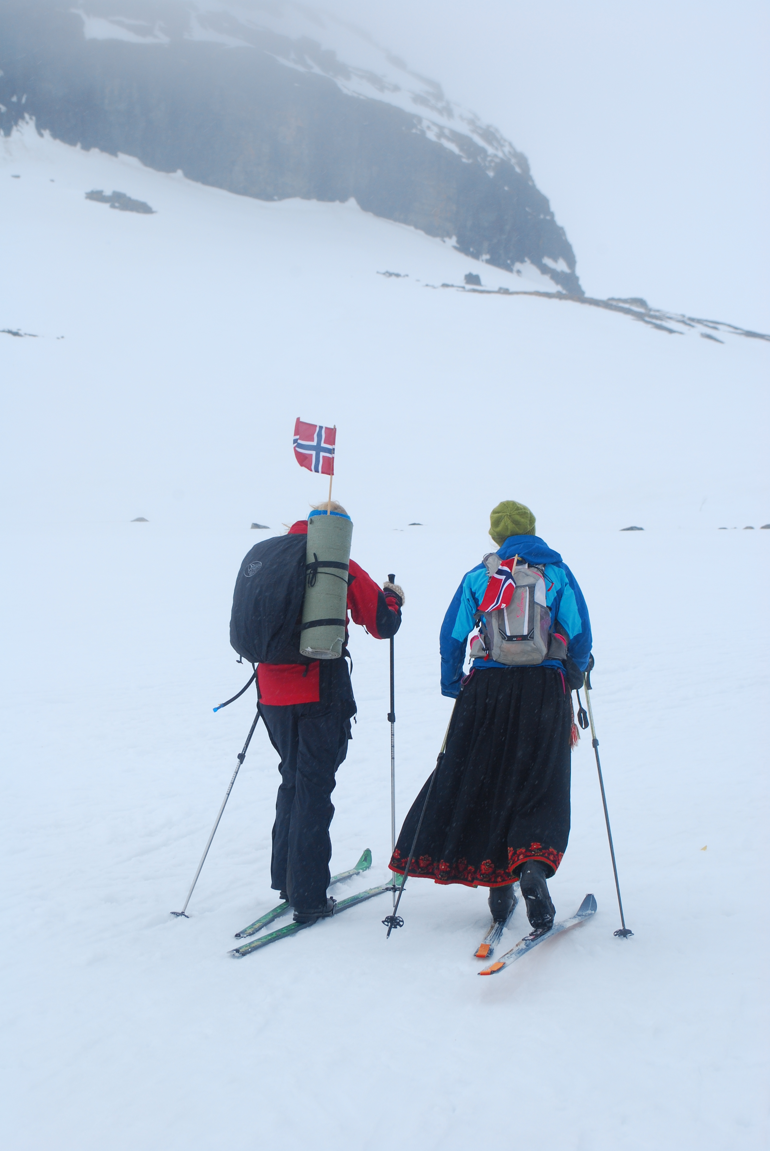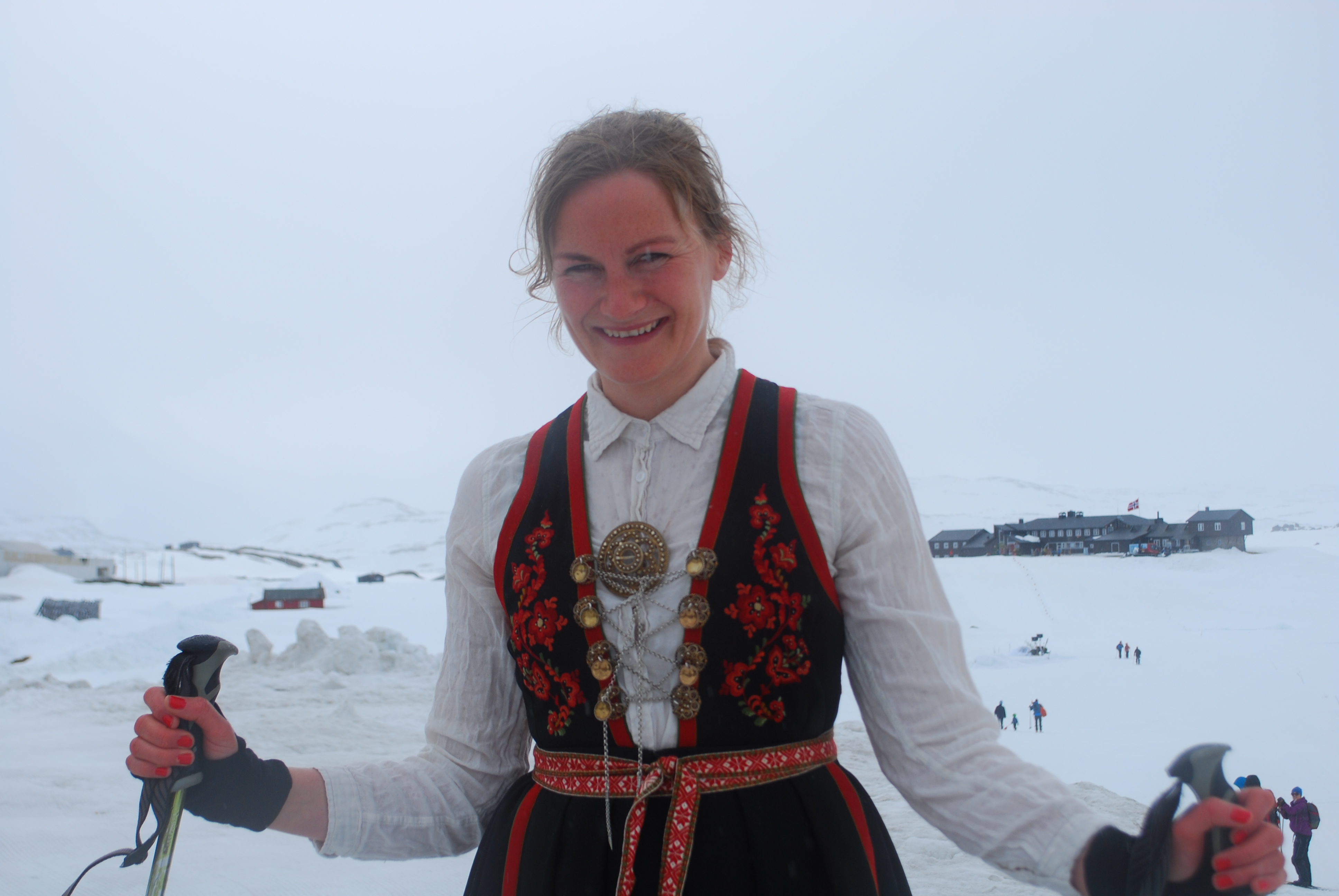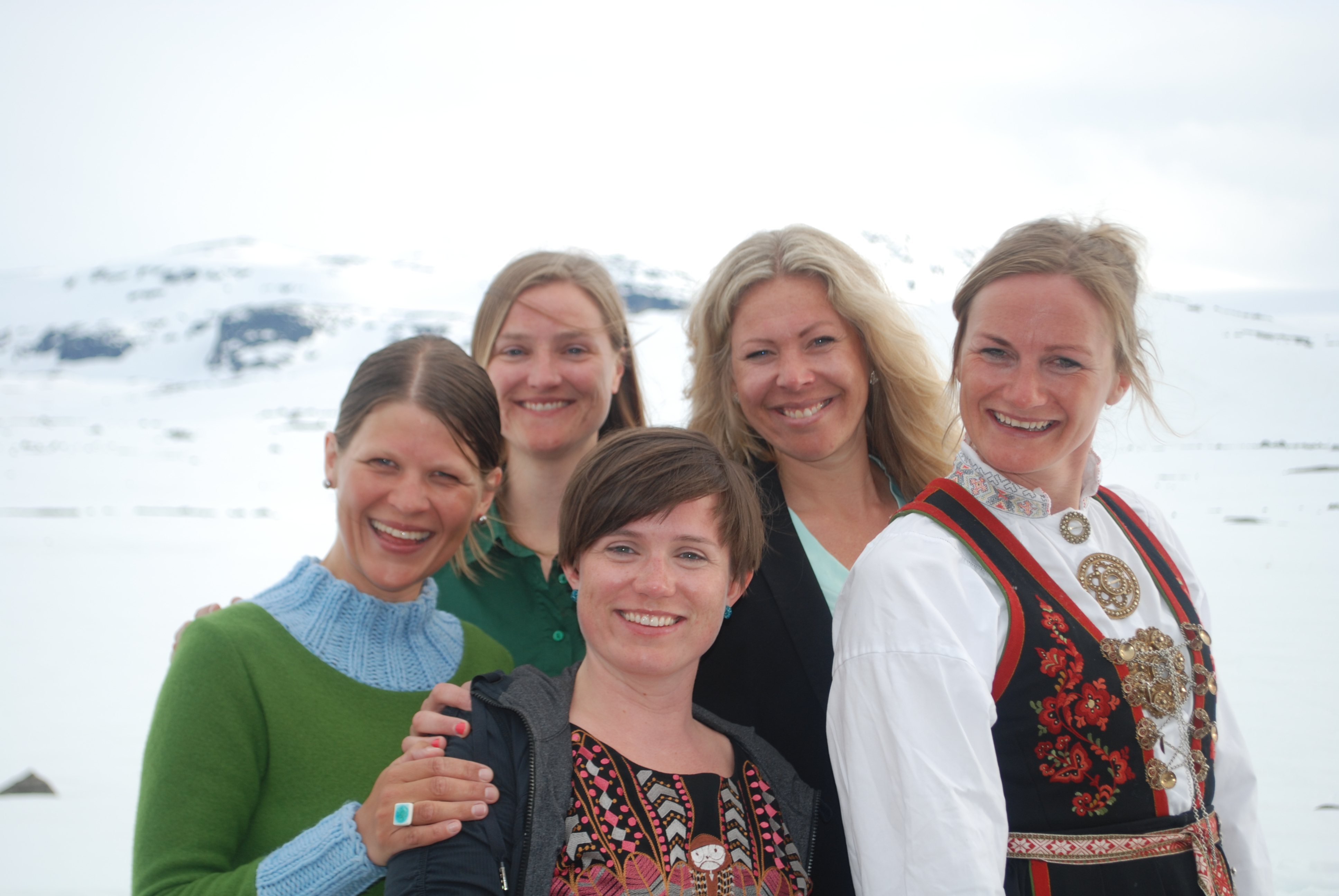 I år gikk 17.maitoget til Finse og Hardangerjøkulen. Fem jenter; Marte, Tone, Elisabeth, Hanne Marte og meg, pluss mange flere feiret grunnlovsjubileet på alternativt vis. Sludd og tåke fra morgenen og en ganske kald tur opp til Jøkulhytta på toppen. De norskeste norske var kledd i bunad og Tone var en av dem. Resten gikk for goretexen. Kransekake, hvitvin, varmende toddy og god stemning på toppen, før nedkjøring og solgløtt og mer og mer utsikt. Klaverkonsert utendørs på Finse da vi kom ned var magisk. Nasjonalromantiske Grieg-toner, varmende sol og utsikt til bre og hvite fjell. En fargerik forsamling og flagget til topps. Vakkert for øye og sjel!