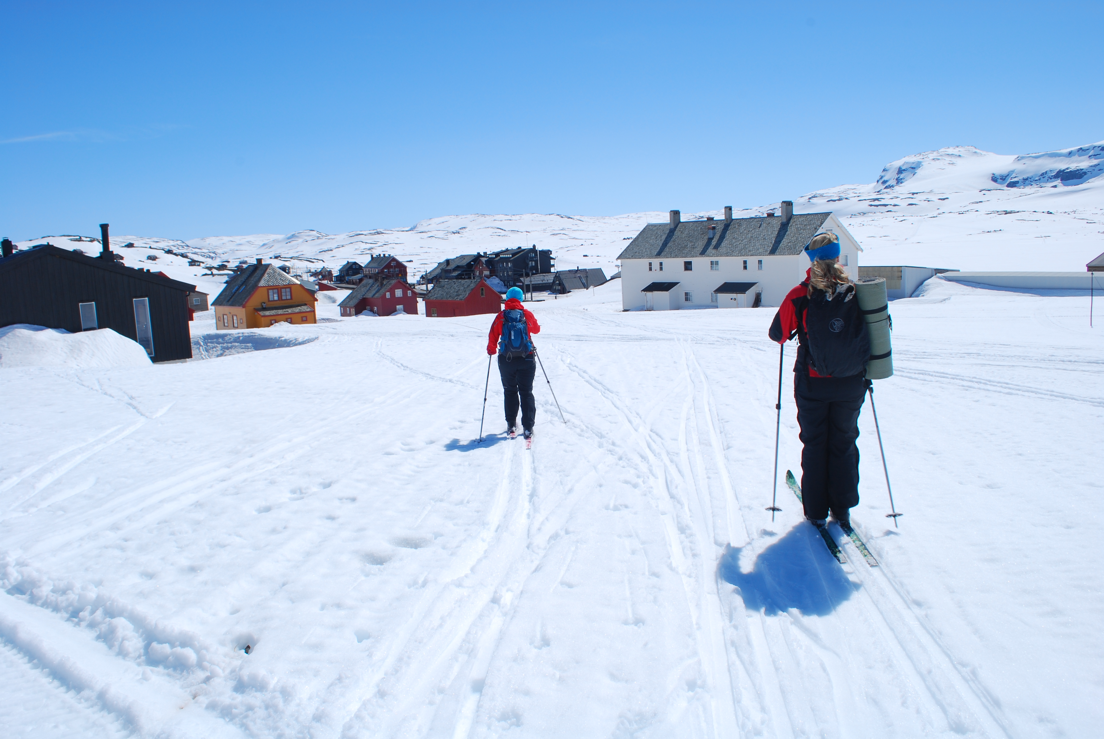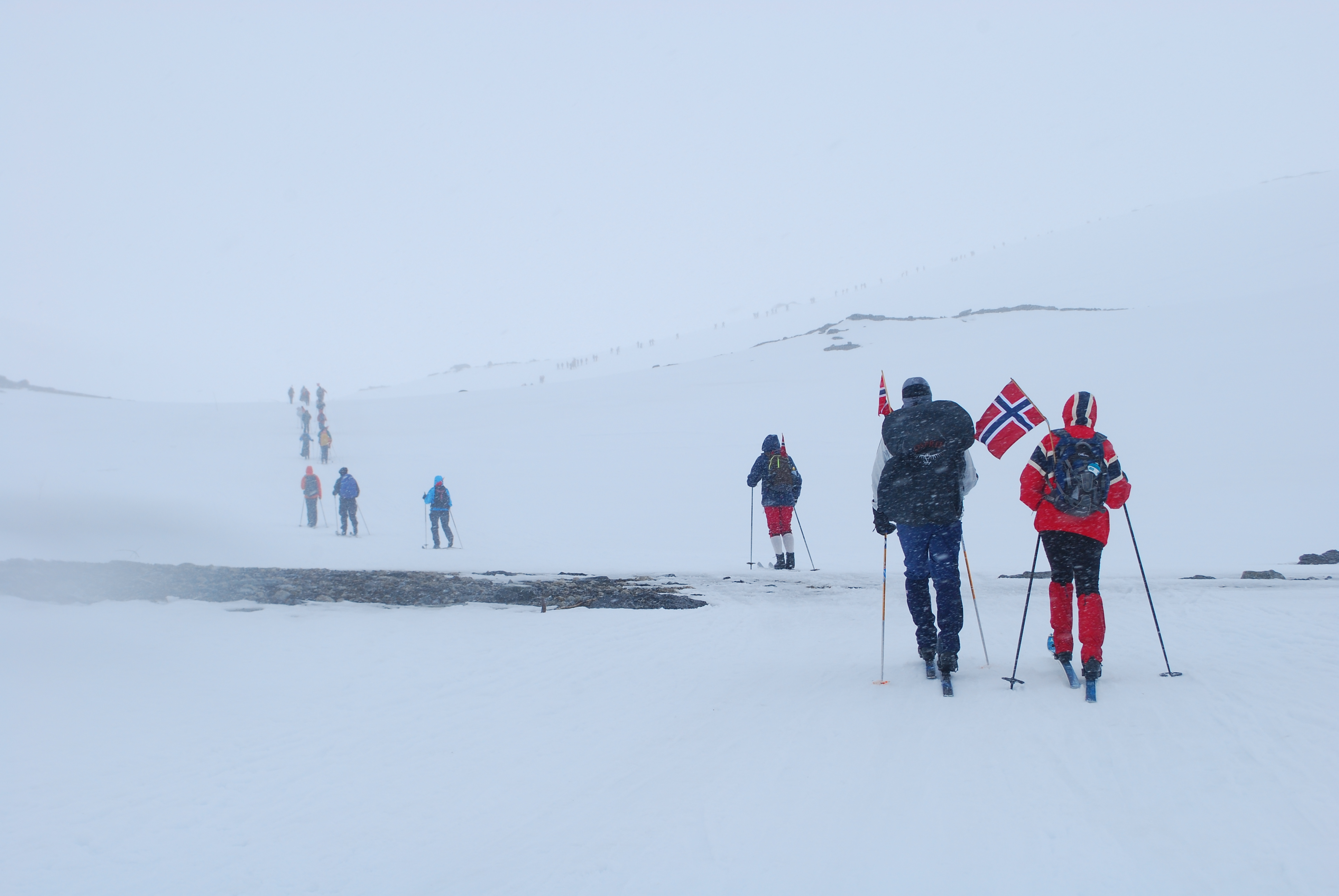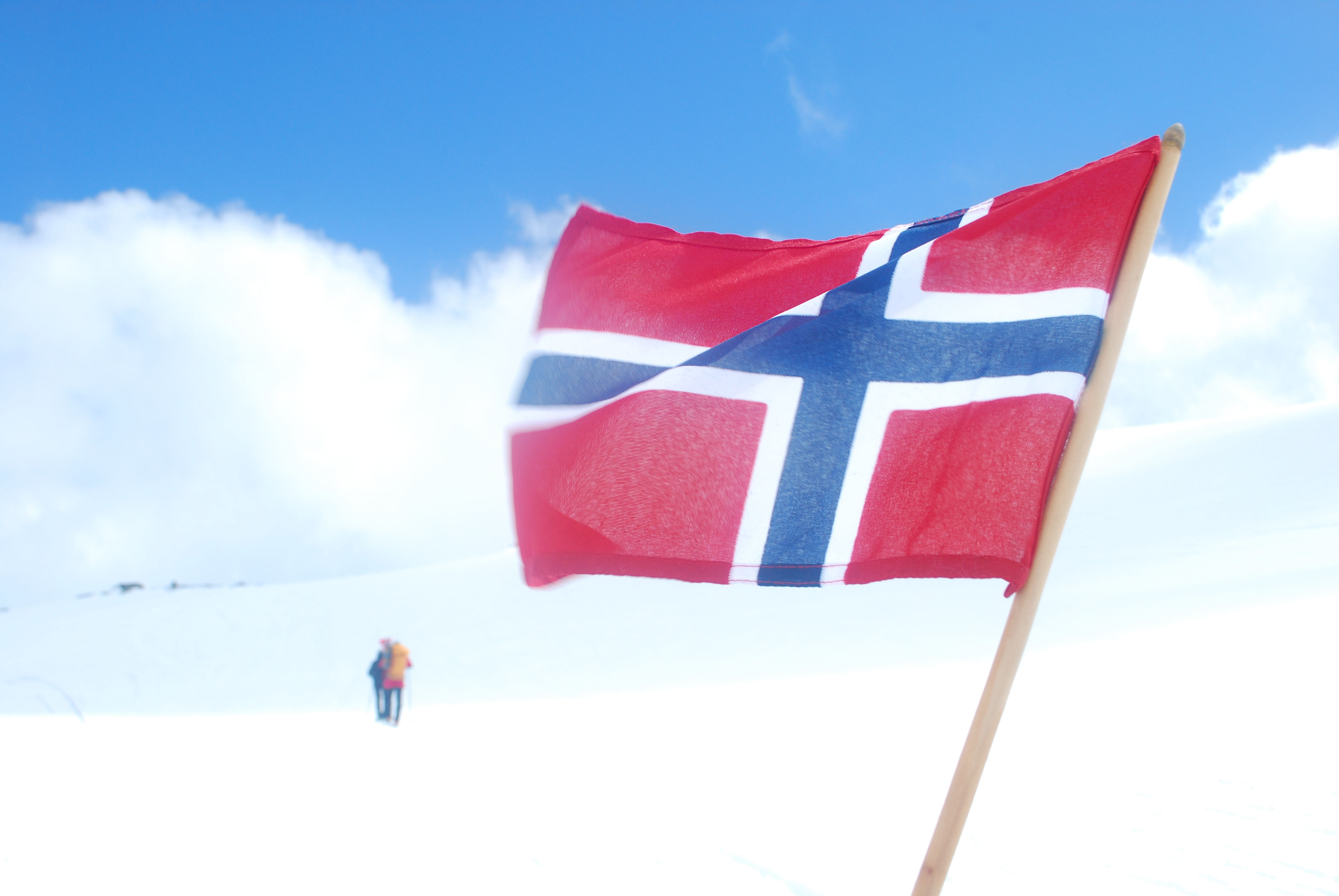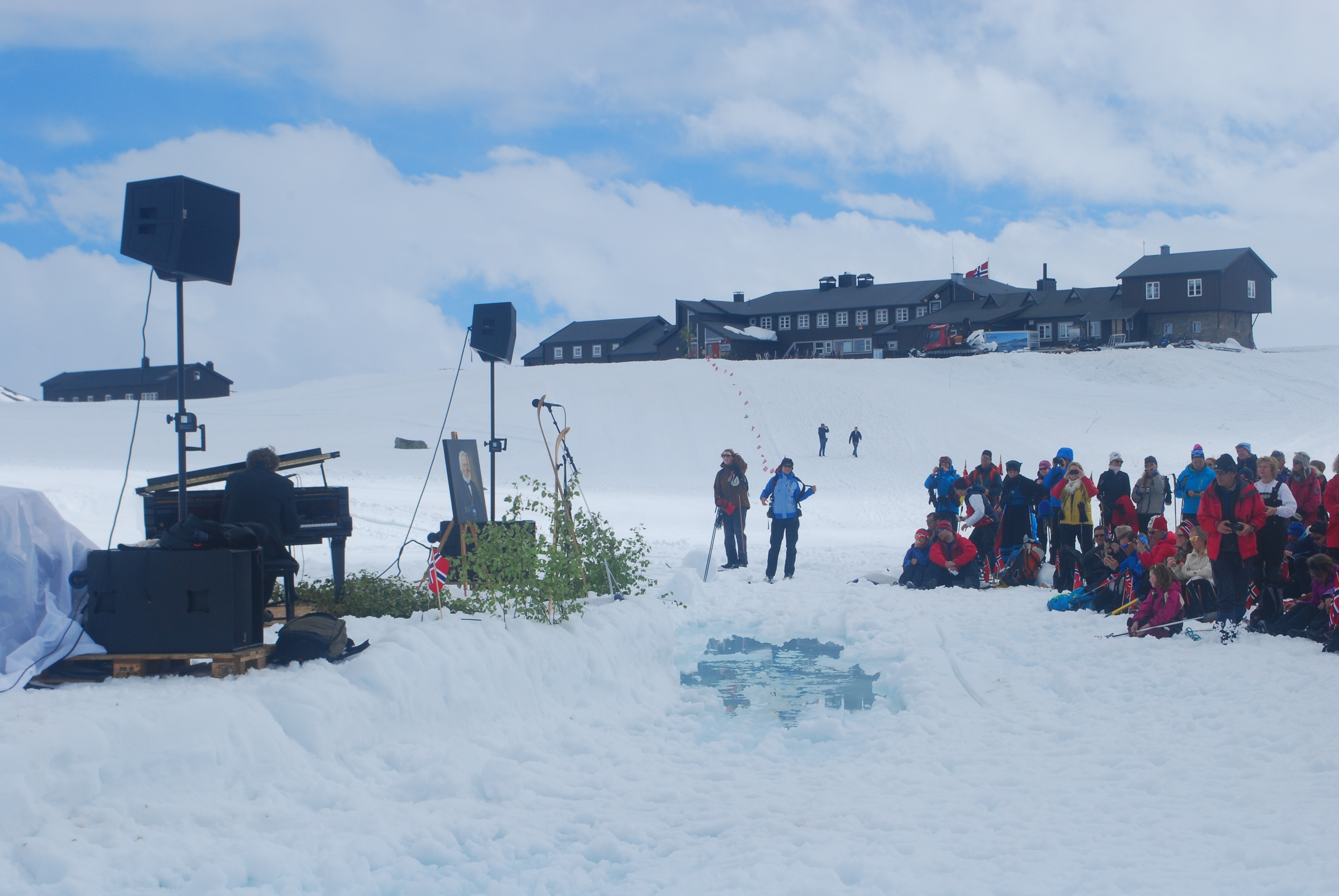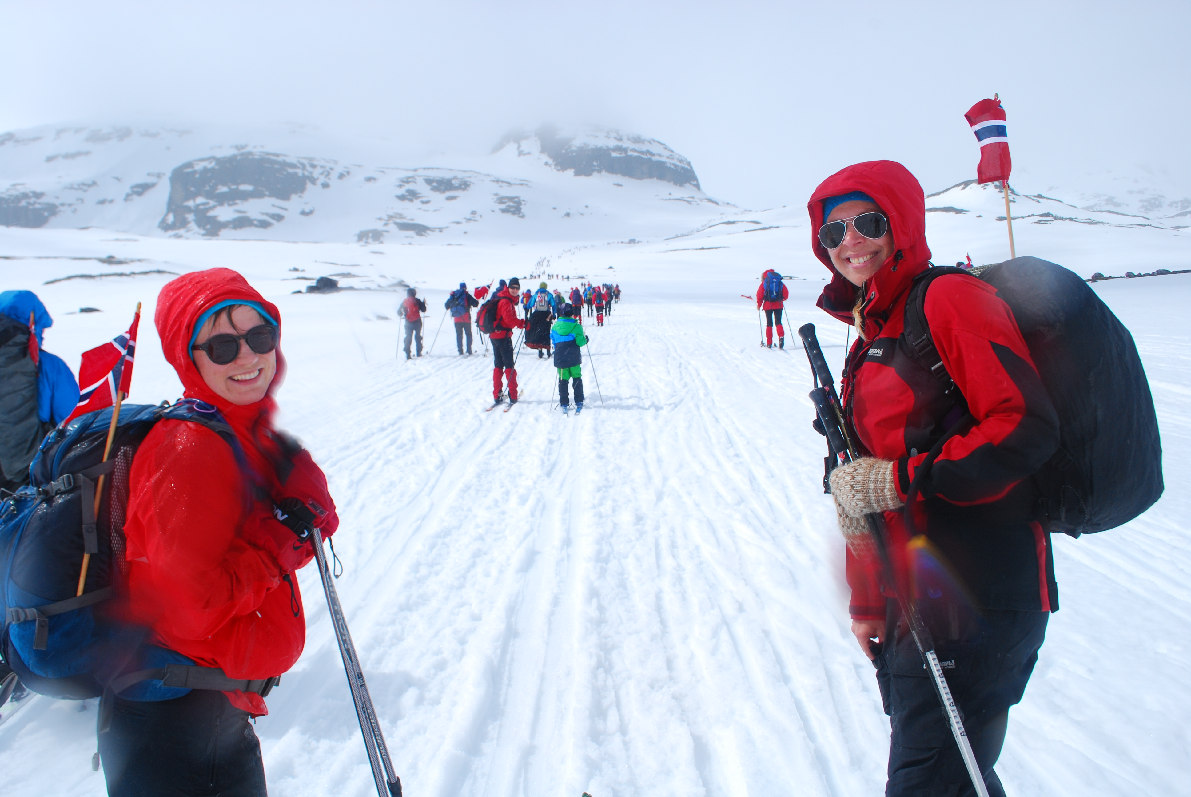 I år gikk 17.maitoget til Finse og Hardangerjøkulen. Fem jenter; Marte, Tone, Elisabeth, Hanne Marte og meg, pluss mange flere feiret grunnlovsjubileet på alternativt vis. Sludd og tåke fra morgenen og en ganske kald tur opp til Jøkulhytta på toppen. De norskeste norske var kledd i bunad og Tone var en av dem. Resten gikk for goretexen. Kransekake, hvitvin, varmende toddy og god stemning på toppen, før nedkjøring og solgløtt og mer og mer utsikt. Klaverkonsert utendørs på Finse da vi kom ned var magisk. Nasjonalromantiske Grieg-toner, varmende sol og utsikt til bre og hvite fjell. En fargerik forsamling og flagget til topps. Vakkert for øye og sjel!