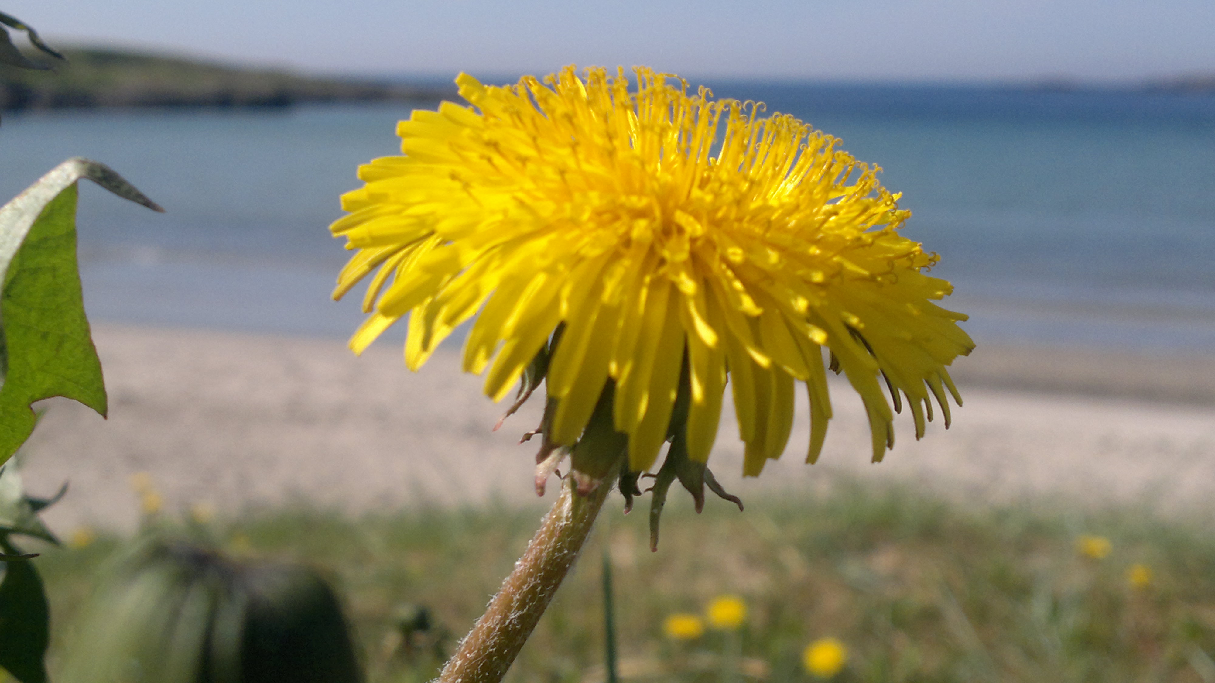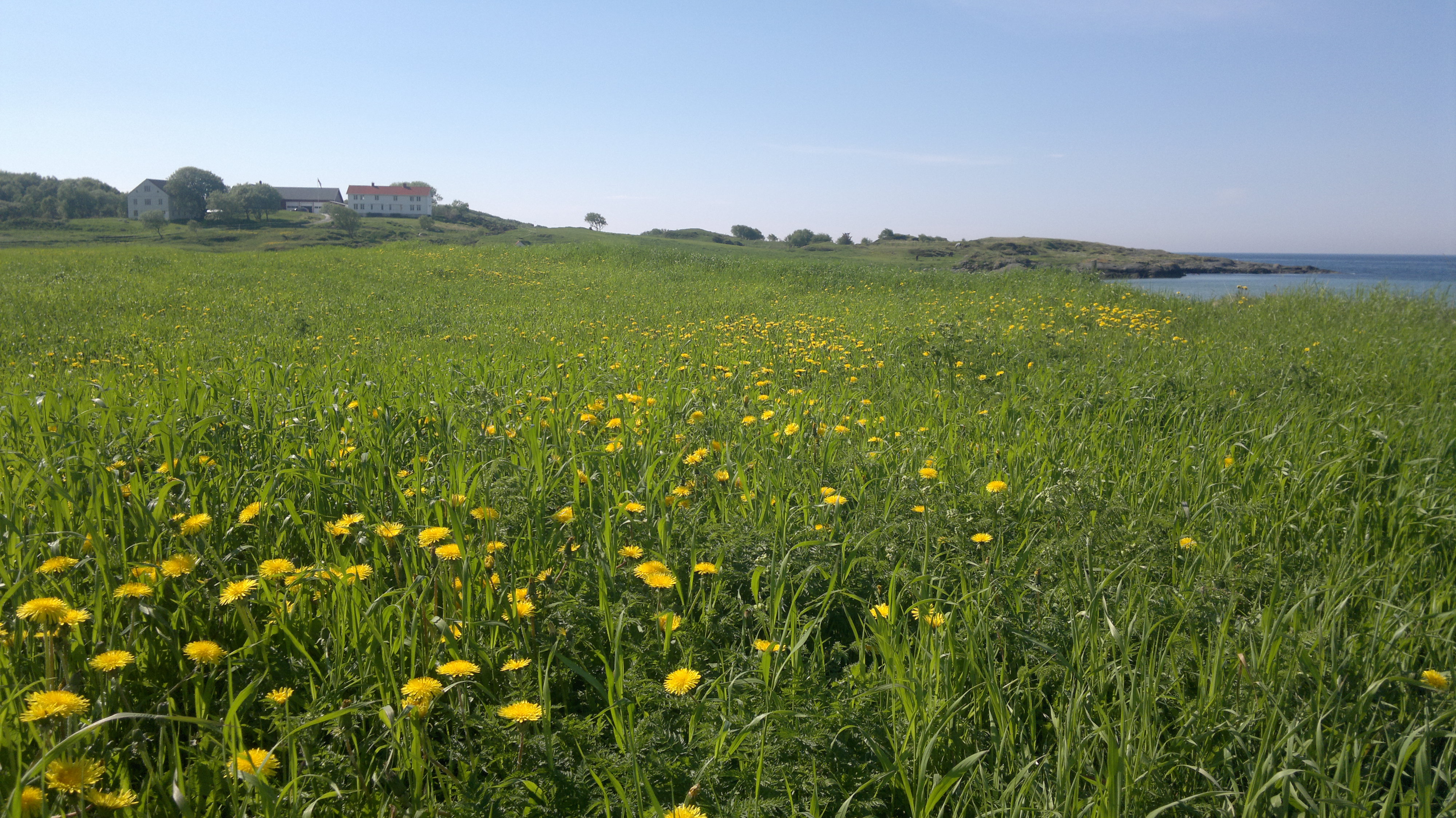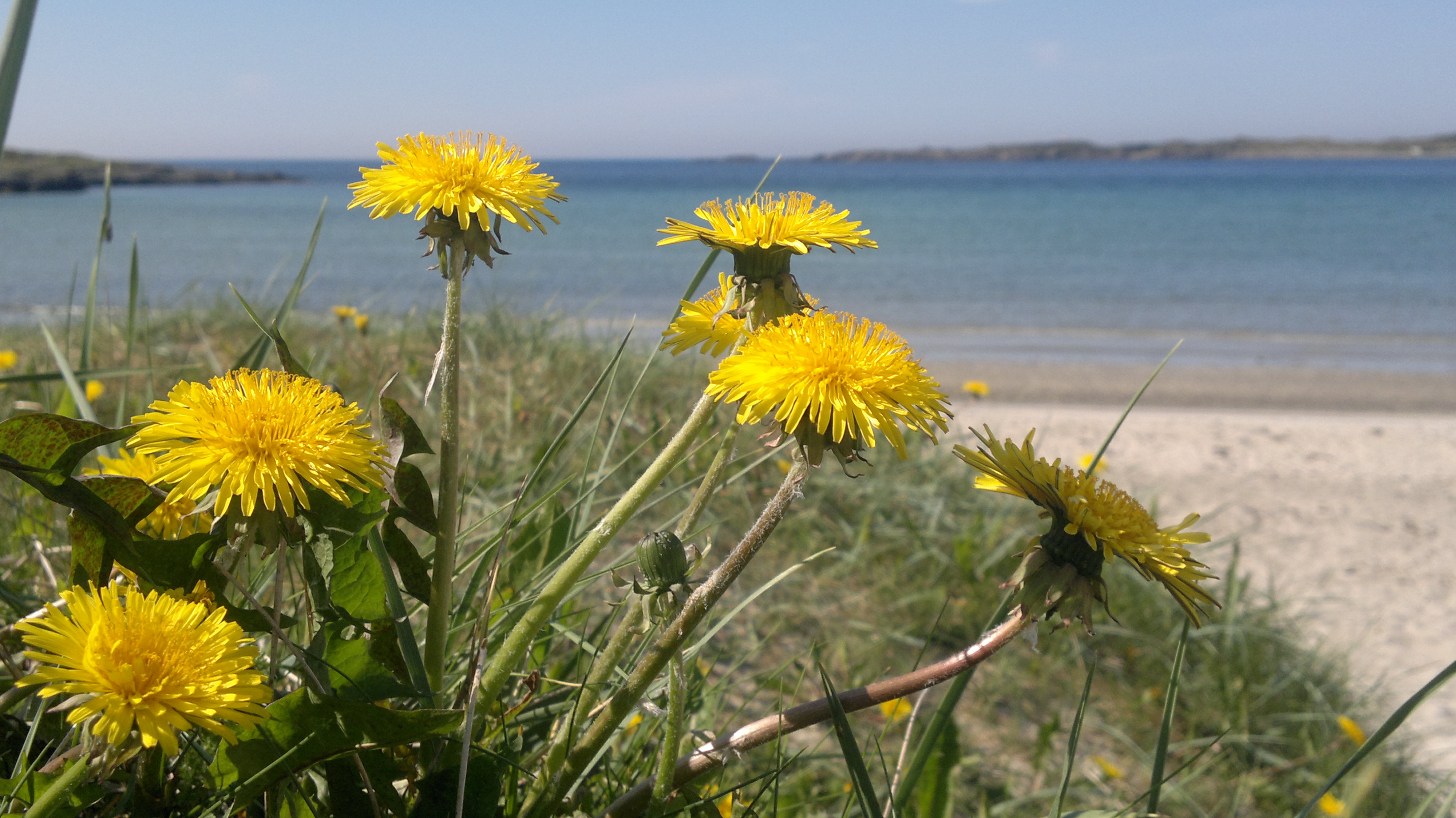 Atlanterhavsveien mellom Molde og Kristiansund en maidag. Farstadstranda med gule løvetenner, grønt siv, hvit sand og blått hav. Det var verdt en liten stopp…!
